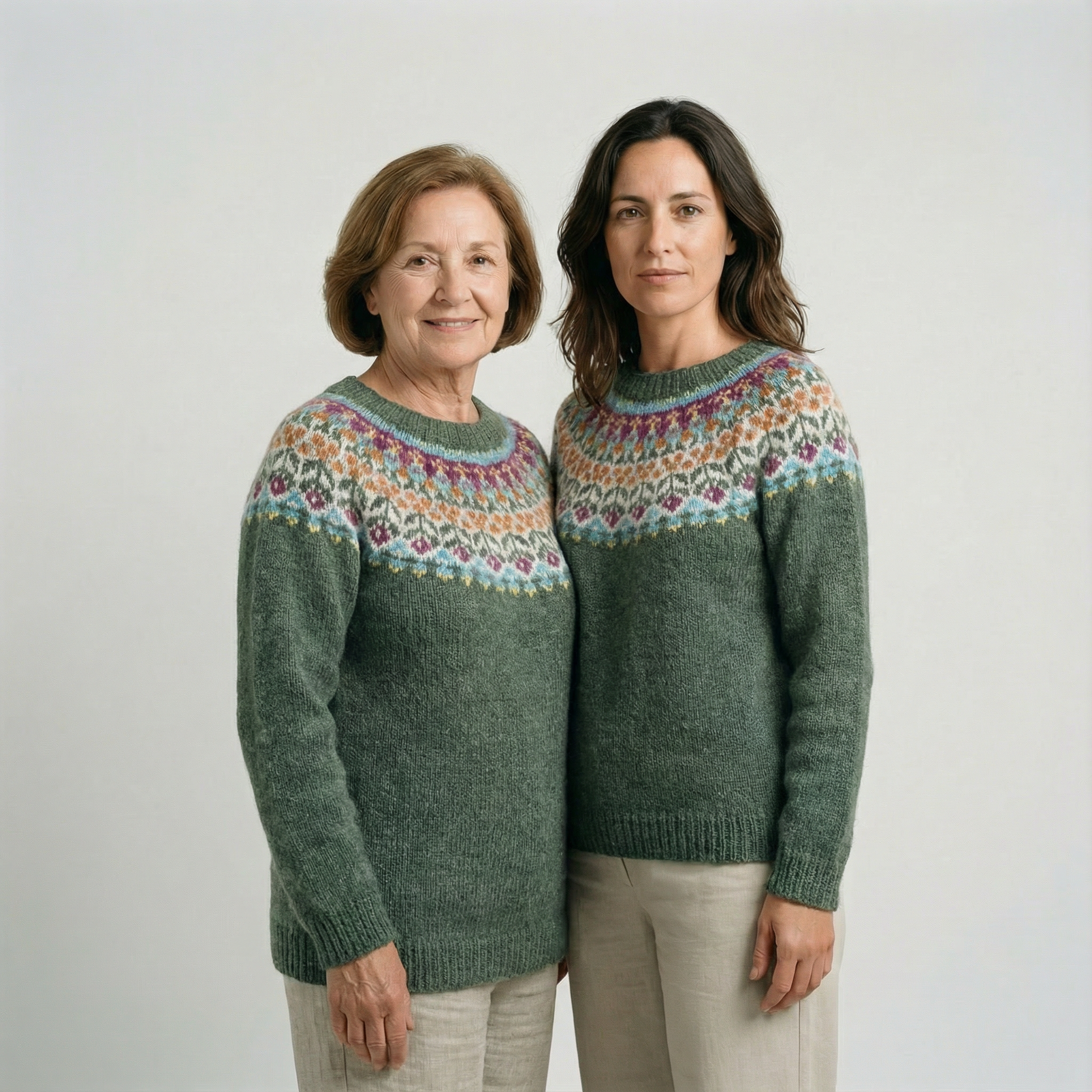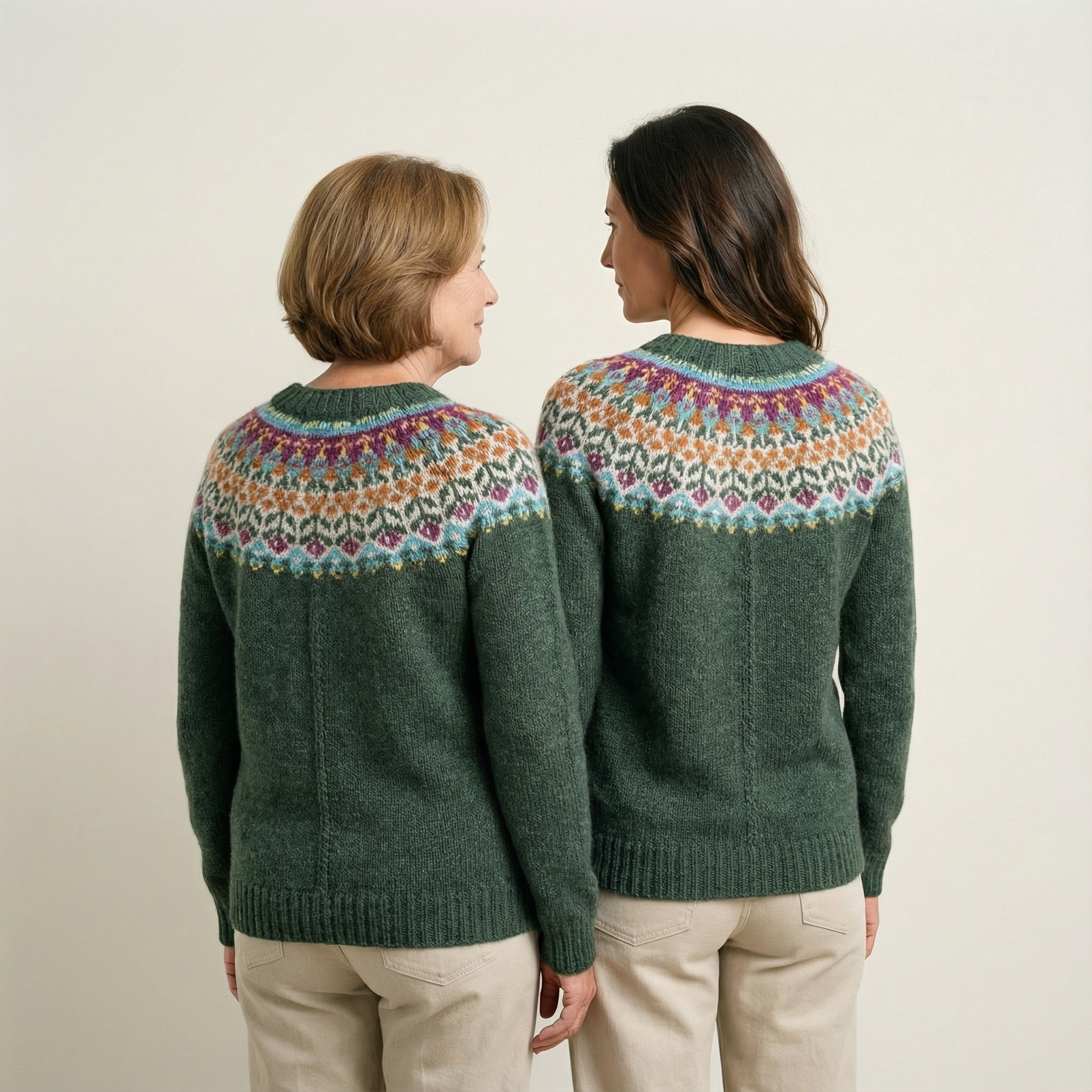 El suéter Layla trae la alegría de las flores invernales a tu armario con su hermoso canesú islandés inspirado en flores. La base en verde bosque contrasta perfectamente con vibrantes tonos de rosa, azul y dorado, una versión alegre y elegante del clásico punto escandinavo. Diseñado para abrigo y movimiento, esta suave mezcla de lana se siente lujosa sobre la piel y ofrece forma sin ajustarse demasiado.