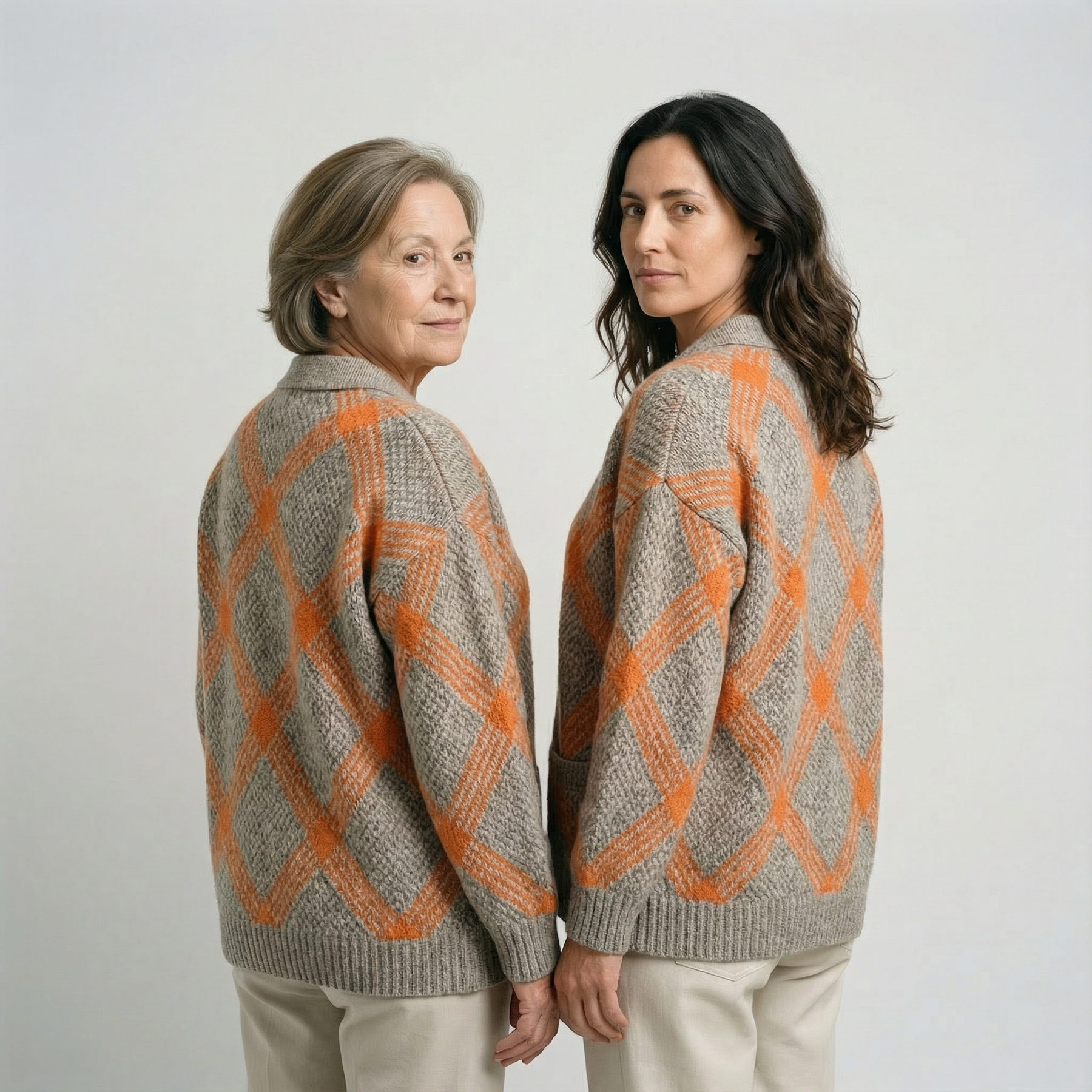 Calentito, moderno y con mucho rollo: Viviana es el suéter que le da energía a cualquier outfit. El diseño de cuadros modernos con toques naranjas crea un estilo elegante pero con personalidad, perfecto si te gusta destacar sin exagerar.