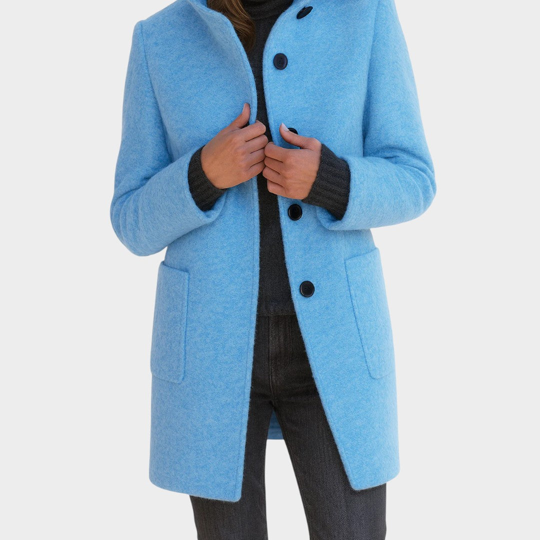 Luce sofisticación y estilo con este abrigo de mujer color azul, una prenda imprescindible para la temporada otoño-invierno. Su diseño clásico con botones frontales y cuello alto combina elegancia y funcionalidad, aportando abrigo sin sacrificar el estilo.