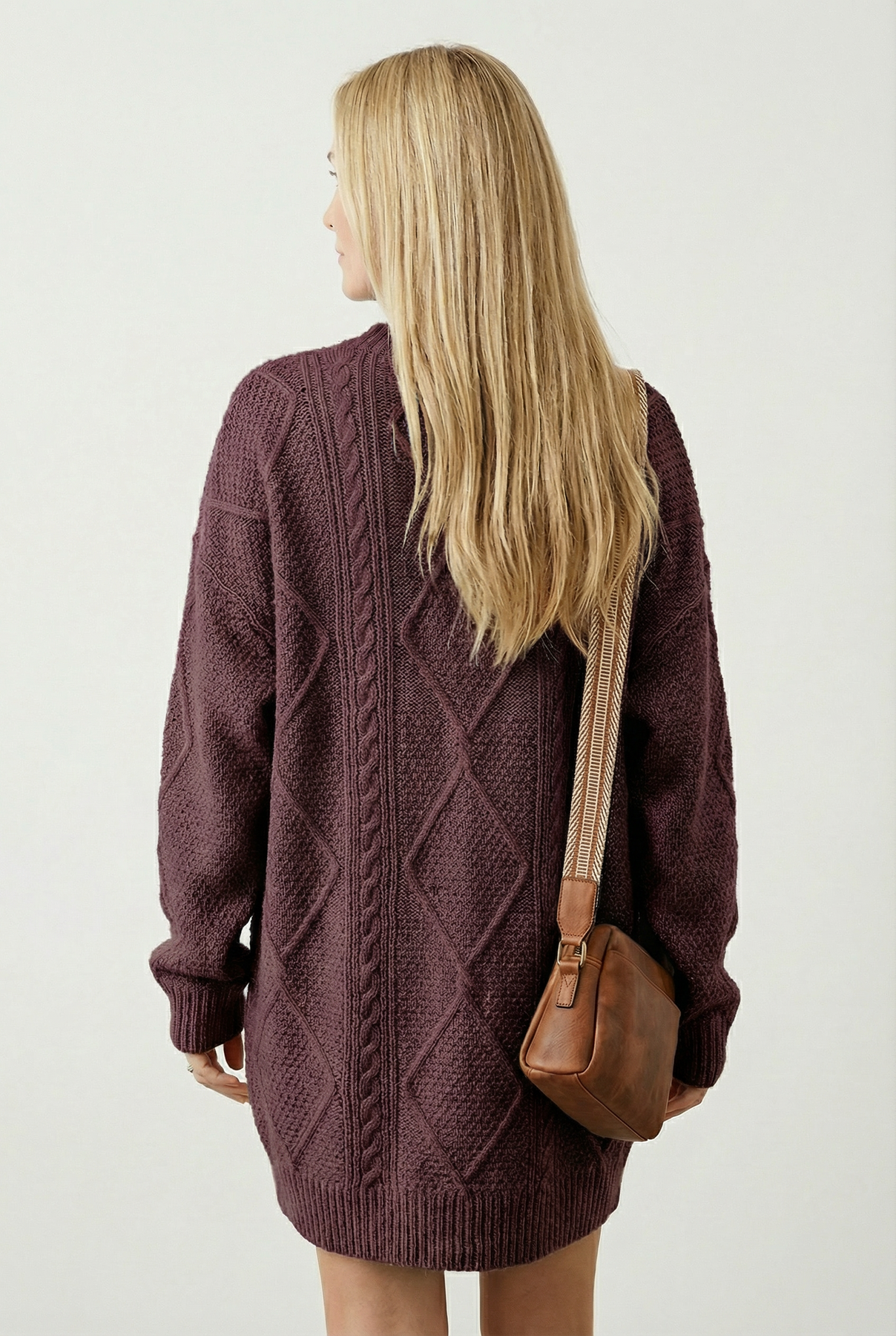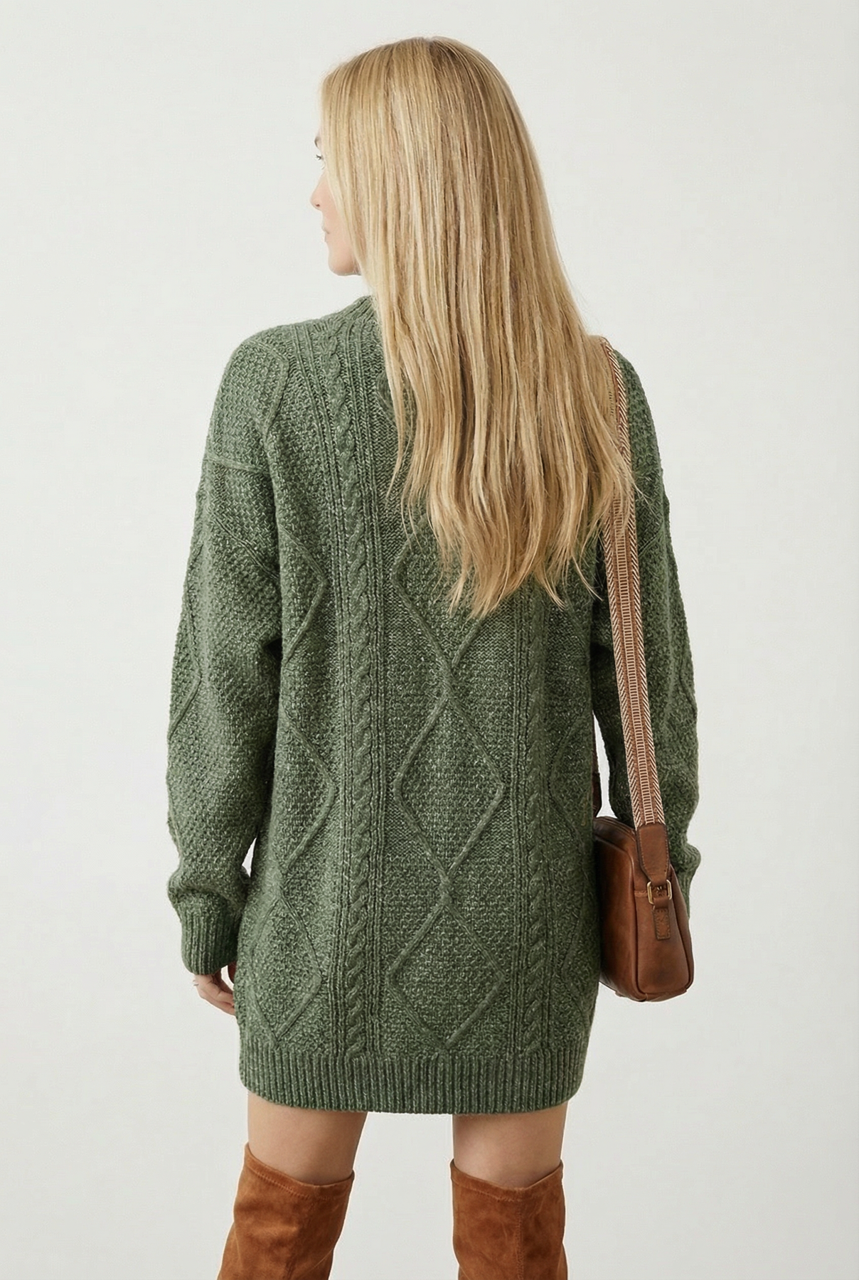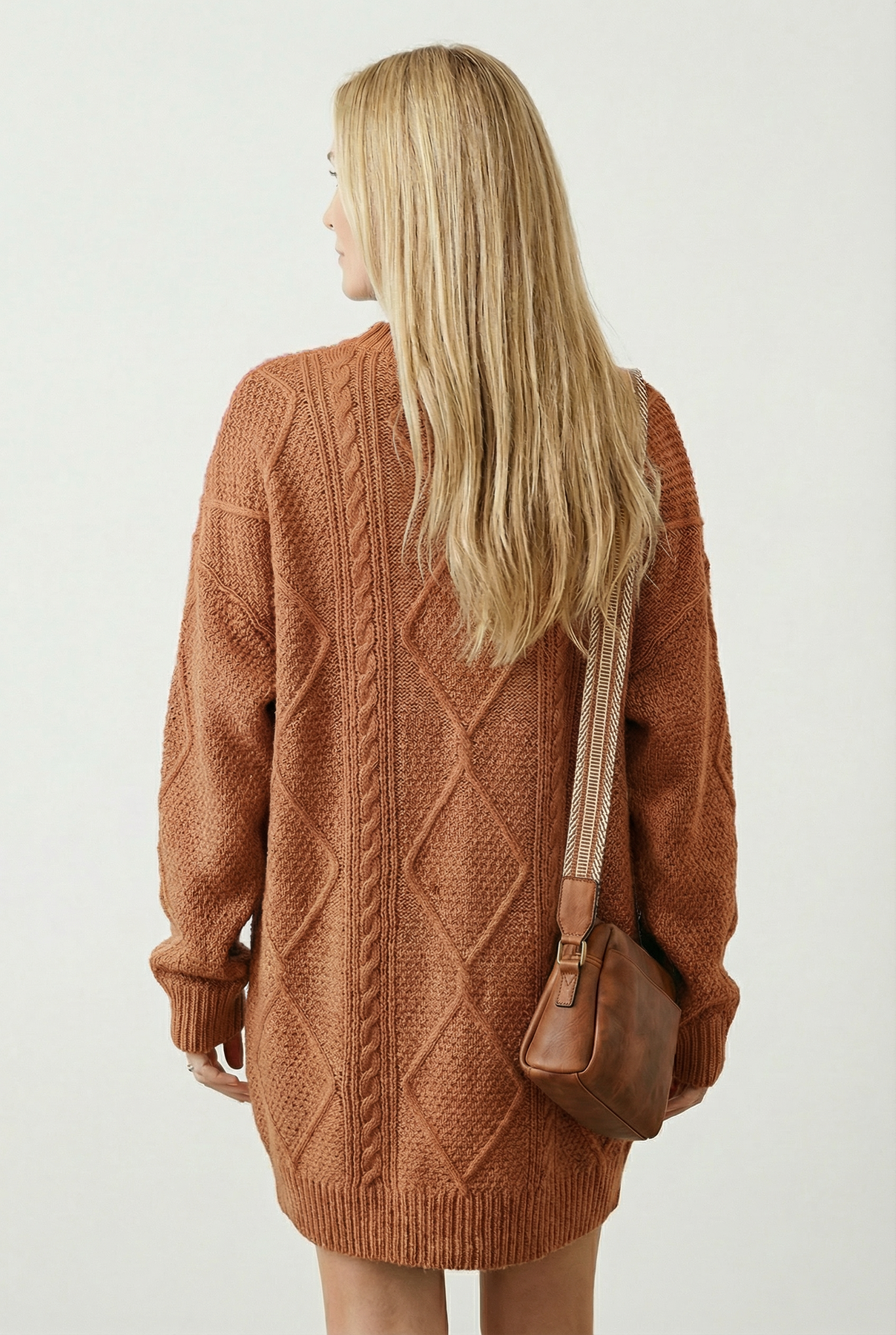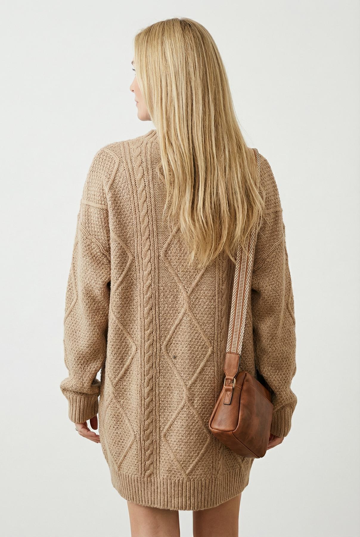Helena es un suéter oversized atemporal de punto torsadé que combina confort y elegancia natural. Su corte largo y relajado lo hace versátil: se puede usar como un vestido acogedor, como una túnica sobre un legging o superpuesto a unos jeans para un look casual y chic. Ideal para los días más frescos, su tejido texturizado y su sensación de calidez lo convierten en una prenda imprescindible en tu guardarropa para el otoño y el invierno.