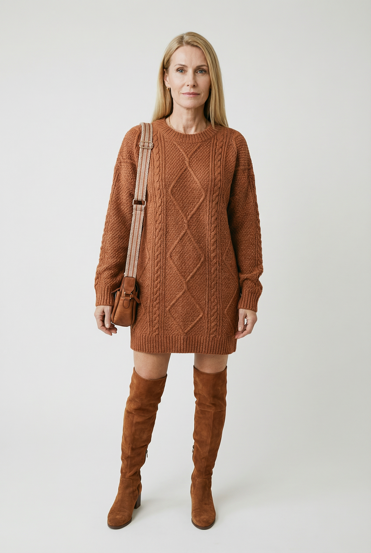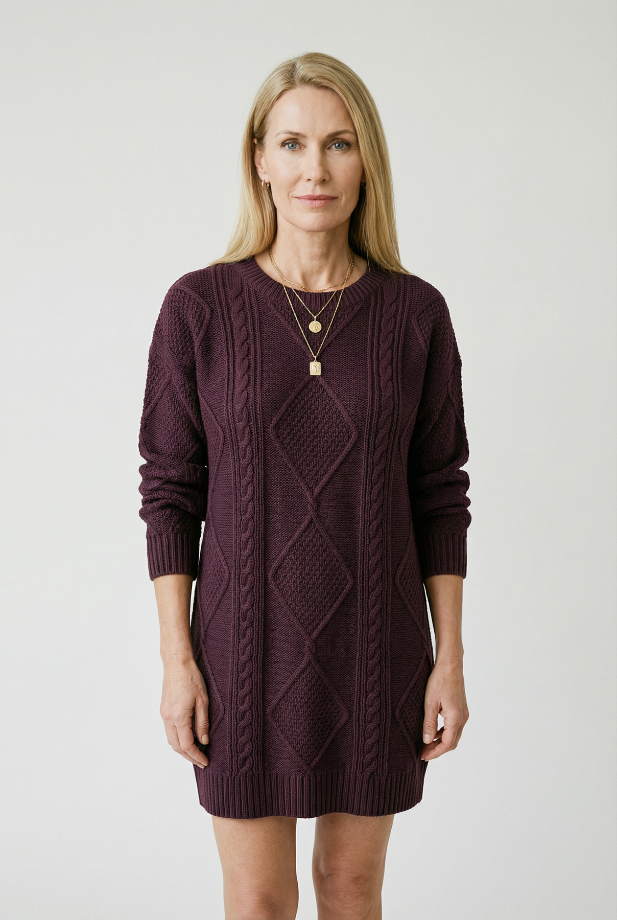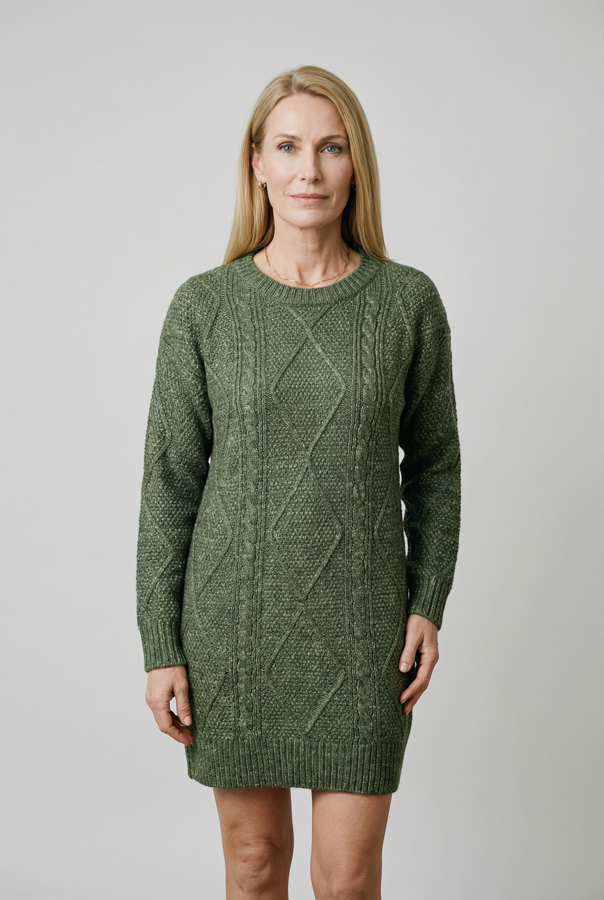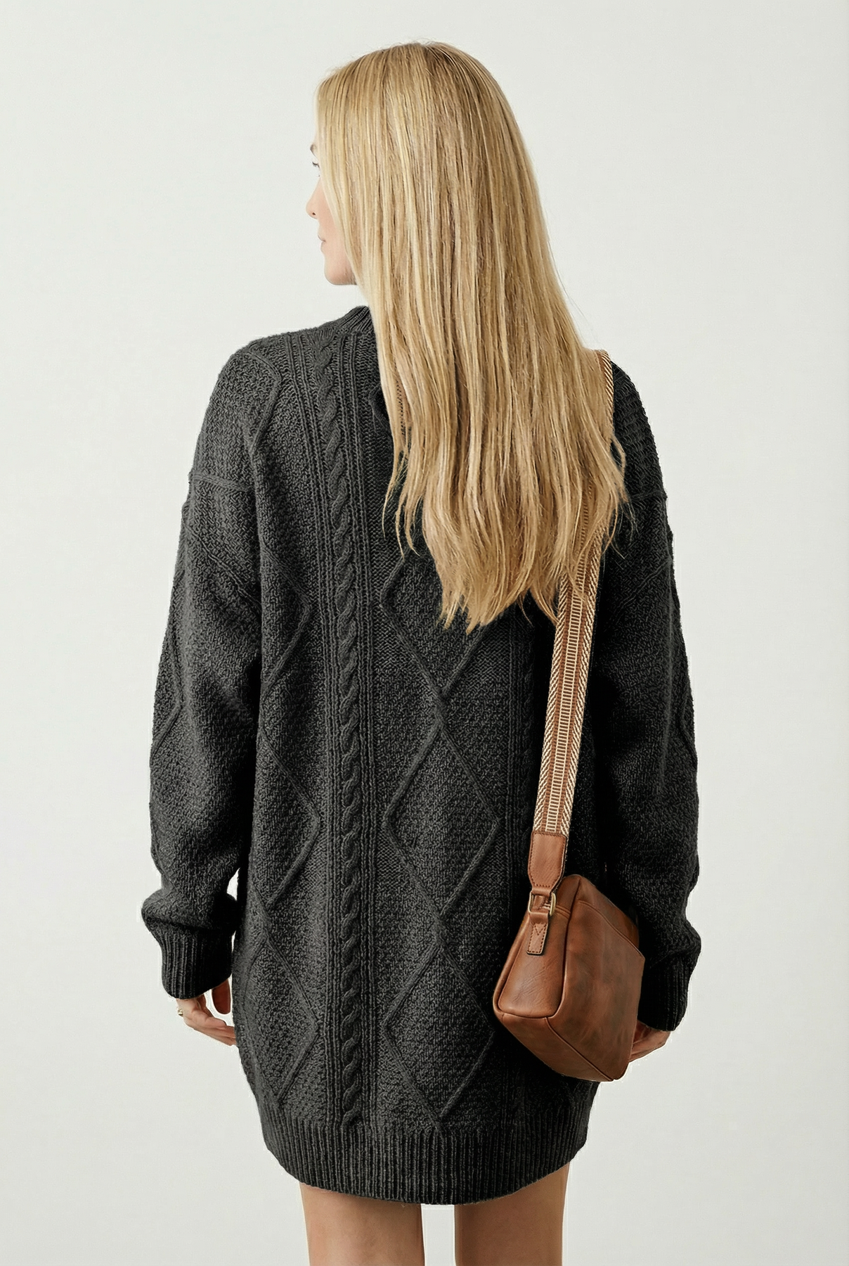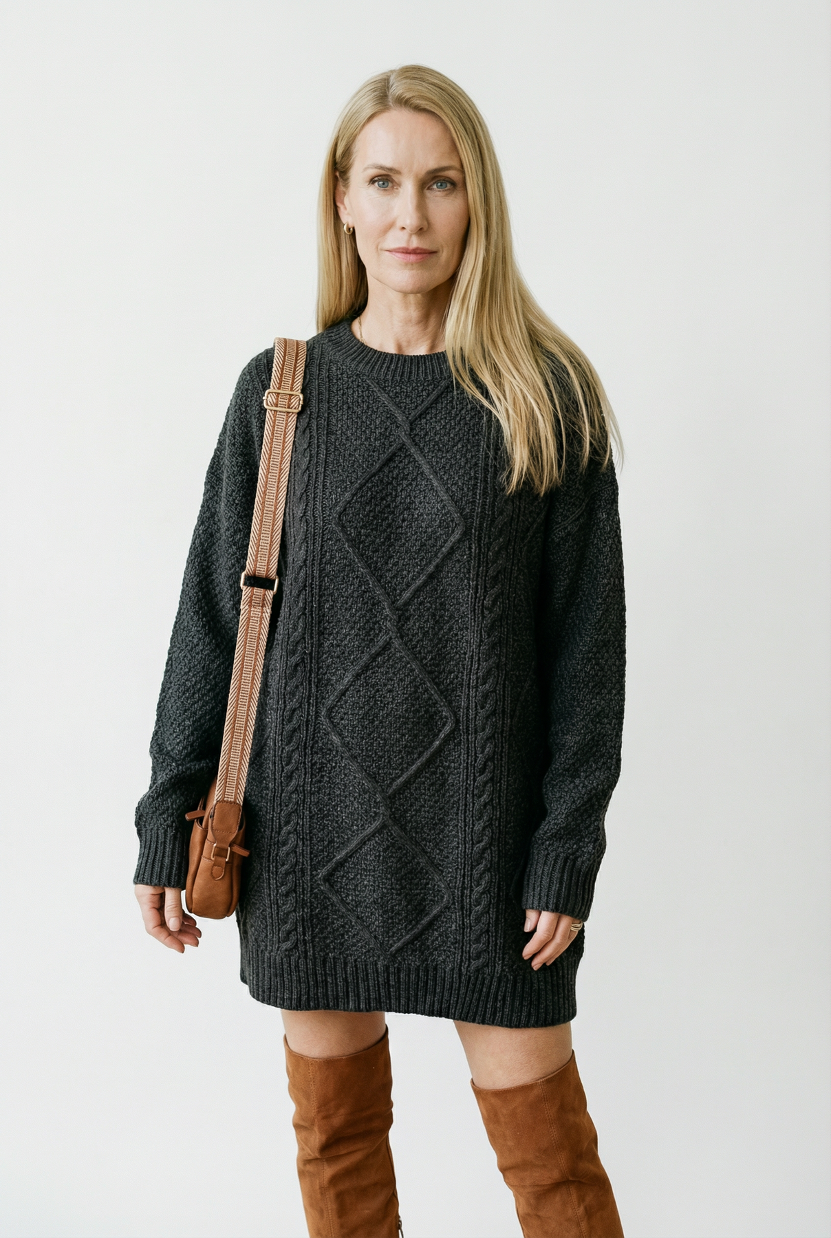 Helena es un suéter oversized atemporal de punto torsadé que combina confort y elegancia natural. Su corte largo y relajado lo hace versátil: se puede usar como un vestido acogedor, como una túnica sobre un legging o superpuesto a unos jeans para un look casual y chic. Ideal para los días más frescos, su tejido texturizado y su sensación de calidez lo convierten en una prenda imprescindible en tu guardarropa para el otoño y el invierno.