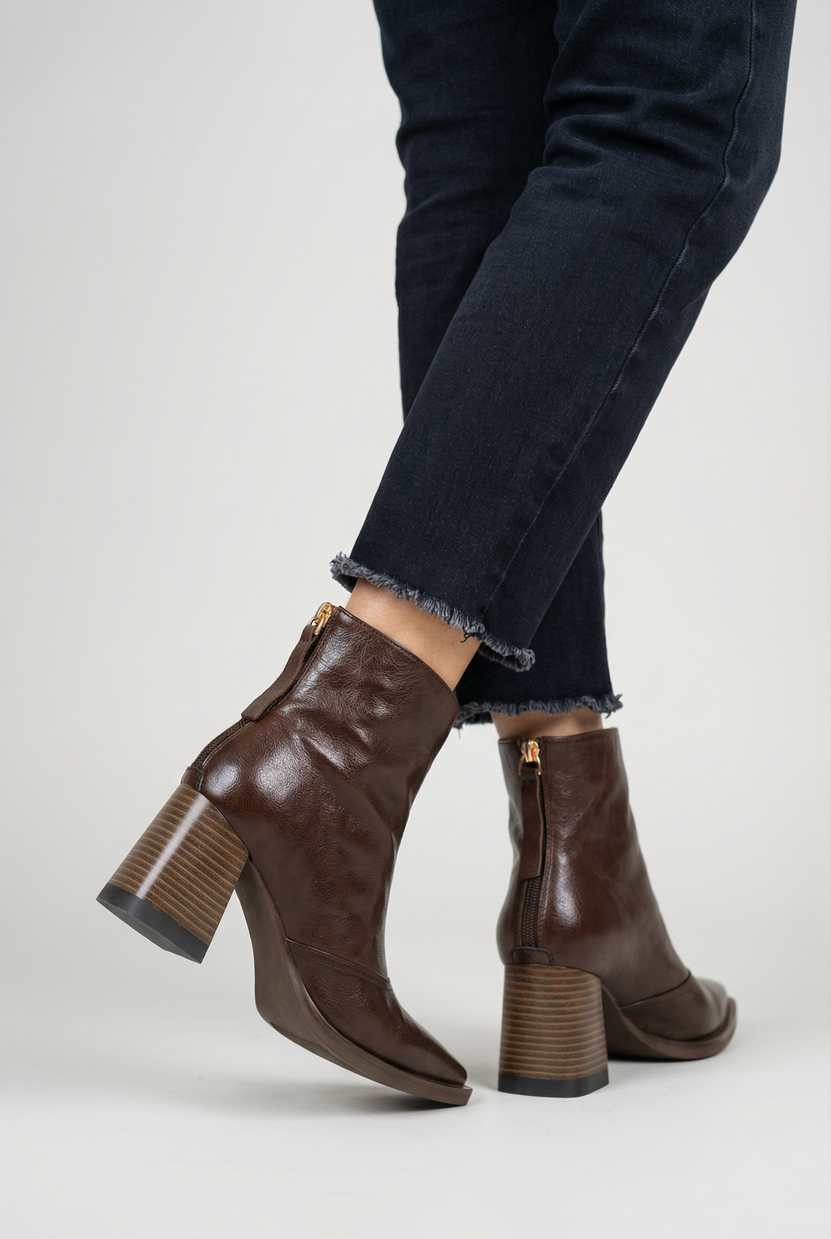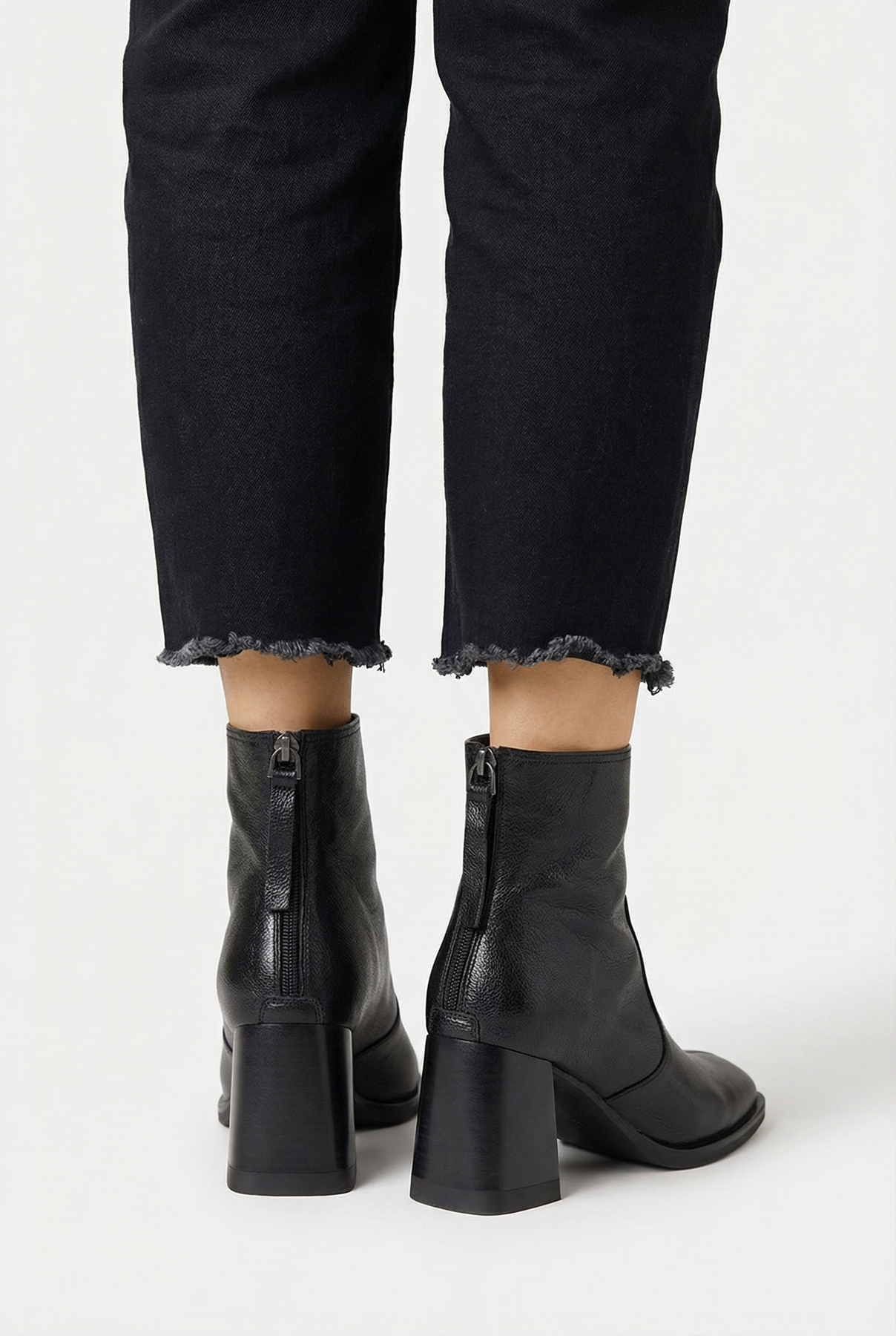 Confeccionados en piel suave y modelados con un tacón medio esculpido, estos botines combinan estructura, comodidad y una silueta estilizada que aporta equilibrio a la figura. Los acabados minimalistas y el diseño moderno los convierten en una prenda atemporal, capaz de realzar cualquier look desde la mañana hasta la noche. Son botines pensados para la vida real: elegantes, cómodos y adecuados para cualquier ocasión.